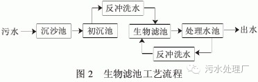 生物濾池:其最大的特點(diǎn)是集生物氧化和截留懸浮固體于一體,節(jié)省了后續(xù)沉淀池,厭氧水解—高負(fù)荷生物濾池處理系統(tǒng)集初沉池、曝氣池、污泥回流設(shè)施以及供氧設(shè)施等于一身,大大簡(jiǎn)化了污水處理流程。生物濾池工藝流程見(jiàn)圖2。