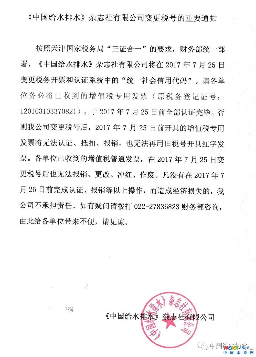 按照天津國(guó)家稅務(wù)局“三證合一”的要求,財(cái)務(wù)部統(tǒng)一部署,《中國(guó)給水排水》雜志社有限公司將在2017年7月25日變更稅務(wù)開(kāi)票和認(rèn)證系統(tǒng)中的“統(tǒng)一社會(huì)信用代碼”。請(qǐng)各單位務(wù)必將已收到的增值稅專(zhuān)用發(fā)票(原稅務(wù)登記證號(hào):120103103370821),于2017年7月25日前全部認(rèn)證完畢。否則我公司變更稅號(hào)后,2017年7月25日前開(kāi)具的增值稅專(zhuān)用發(fā)票將無(wú)法認(rèn)證、抵扣、報(bào)銷(xiāo),也無(wú)法再用舊稅號(hào)開(kāi)具紅字發(fā)票。各單位已收到的增值稅普通發(fā)票,在2017年7月25日變更稅號(hào)后也無(wú)法報(bào)銷(xiāo)、更改、沖紅、作廢。凡沒(méi)有在2017年7月25日前完成認(rèn)證、報(bào)銷(xiāo)等以上操作,而造成經(jīng)濟(jì)損失的,我公司不承擔(dān)責(zé)任。如有疑問(wèn)請(qǐng)撥打022-27836823財(cái)務(wù)部咨詢(xún),由此給各單位帶來(lái)不便,請(qǐng)見(jiàn)諒。