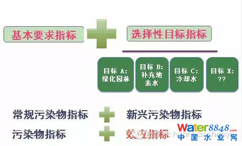 第一種類型是污水處理廠的出水用于園林綠化的灌溉;第二種是作為地表水水源的補(bǔ)充;第三種是在北方可能會(huì)作為工業(yè)的冷卻水。我們要梳理幾種非常典型的目標(biāo),以此來選擇概念廠相應(yīng)的指標(biāo)。
