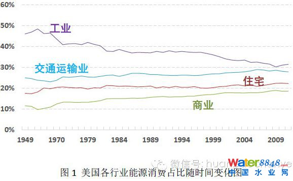 美國各行業(yè)能源消費(fèi)分析,從1949年到2011年,美國工業(yè)消耗電耗占全社會總能耗比例由最高的48%降為約30%,與其他行業(yè)能耗占比接近。