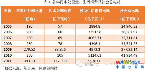 我國目前有6.74億農(nóng)村人口,250多萬個(gè)自然村,60萬個(gè)行政村,4萬多個(gè)鄉(xiāng)鎮(zhèn),每天3000多萬噸污水排放量, 年累計(jì)處理量為87.6億噸(處理率按80%計(jì)算3000*0.8*365),而且村鎮(zhèn)污水處理設(shè)施多為分散式處理,其系統(tǒng)單耗要高于城市集中式污水處理系統(tǒng)的電耗。根據(jù)美國的經(jīng)驗(yàn),分散式處理設(shè)施的單耗是集中式的3到4倍,所以分散式污水處理耗電約為1kwh/m3,全年電耗為87.6億千瓦時(shí), 2011年,污水處理量393.13億立方米,全年城市污水處理電耗117.939億千瓦時(shí),城鄉(xiāng)污水處理共耗電205.539億千瓦時(shí),占全國電力消耗總量的0.44%。