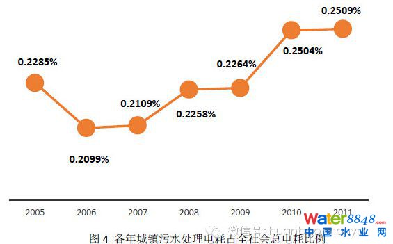 據(jù)文獻(xiàn)報(bào)道,污水處理耗電為0.2-0.3kwh/m3?筛鶕(jù)表2中數(shù)據(jù)計(jì)算出2005-2011年,我國城鎮(zhèn)污水處理電力消費(fèi)量占生活消費(fèi)電耗的2%(如圖3所示),占全社會總電耗的0.25%(如圖4所示),近幾年均呈上升趨勢。