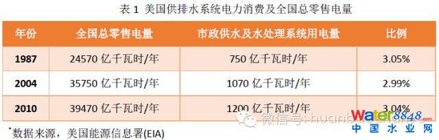 根據(jù)美國EPRI(美國電力研究協(xié)會)1996年做的調(diào)查報(bào)告顯示,當(dāng)時(shí)美國具有超過60000座供水系統(tǒng)及15000座污水處理系統(tǒng)。由于美國屬于非工業(yè)化國家,這些系統(tǒng)在當(dāng)時(shí)已經(jīng)屬于國家最大的能源消費(fèi)行業(yè)。數(shù)據(jù)顯示(見表1),美國20多年供水及水處理系統(tǒng)電耗占社會總零售電量比約為3%。