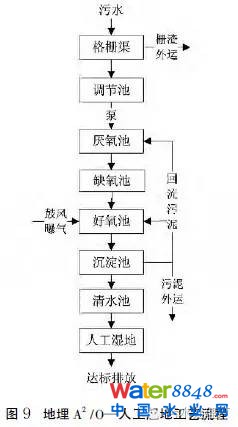 地埋A2/O-人工濕地技術(shù):A2/O 工藝亦稱A-A-O 工藝,本工藝為采用厭氧—缺氧—好氧法生物脫氮除磷工藝的簡(jiǎn)稱,是流程最簡(jiǎn)單,應(yīng)用最廣泛的脫氮除磷工藝。適用于處理要求較高,四季氣候變化大,氣溫較低的地區(qū)。處理規(guī)模不小于200 噸/天。工藝參數(shù): 厭氧池停留時(shí)間不小于2 h,缺氧池停留時(shí)間不小于4 h,好氧池停留時(shí)間不小于6 h,人工濕地水力負(fù)荷0. 5~1. 0 m3/(m2·d) ,污泥理周期180 天,工藝流程見(jiàn)圖9。