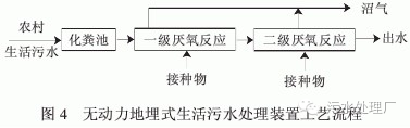 工藝流程為分離池-腐化池-酸化池-氧化池-排放。該工藝無(wú)動(dòng)力、低能耗、占地面積小、出水水質(zhì)好。但是化糞池存在清掏困難、產(chǎn)生惡臭氣體和堵塞管道等缺點(diǎn)。