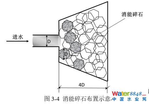 進水口應設置在常水位以上,并設置碎石、消能坎等消能設施,防止水流沖刷和侵蝕。由于城市雨水徑流中往往含有部分生活垃圾,入口處還需設置垃圾攔截裝置(格柵)并定期清理。進水口消能碎石的布置如圖3-4所示。