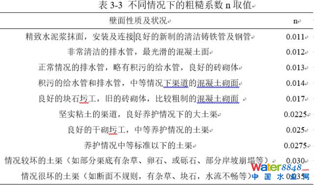 n——粗糙系數(shù),根據(jù)渠道實際情況根據(jù)表3-3確定。