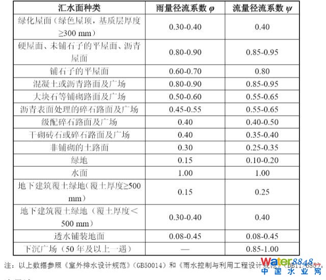 集水區(qū)綜合流量徑流系數(shù)的計算按各地塊滲透性質進行面積加權,具體參照表3-1。