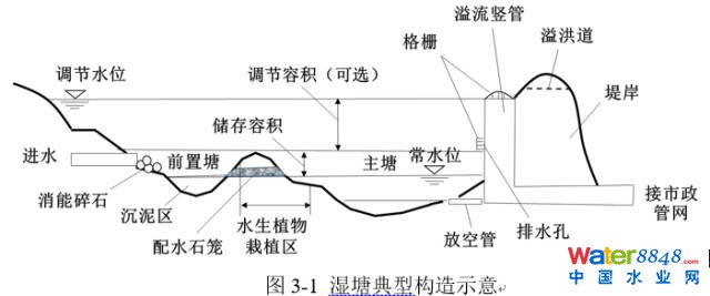 濕塘一般由進水口、前置塘、主塘、溢流出水口、護坡及駁岸、維護通道等構成。