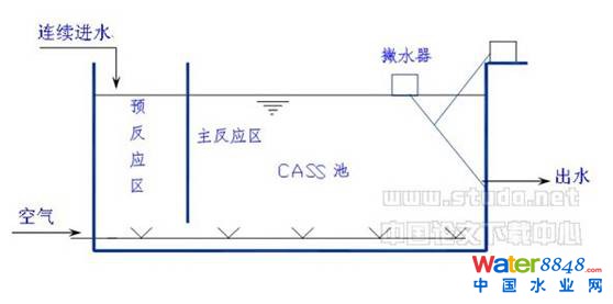 CASS法是在間歇式活性污泥法(SBR法)的基礎(chǔ)上演變而來的,它是在CASS反應(yīng)池前部設(shè)置了生物選擇區(qū),后部設(shè)置了可升降的自動潷水裝置。其工作過程可分為曝氣、沉淀和排水三個(gè)階段,周期循環(huán)進(jìn)行。污水連續(xù)進(jìn)入預(yù)反應(yīng)區(qū),經(jīng)過隔墻底部進(jìn)入主反應(yīng)區(qū),在保證供氧的條件下,使有機(jī)物被池中的微生物降解。根據(jù)進(jìn)水水質(zhì)可對運(yùn)行參數(shù)進(jìn)行調(diào)整。