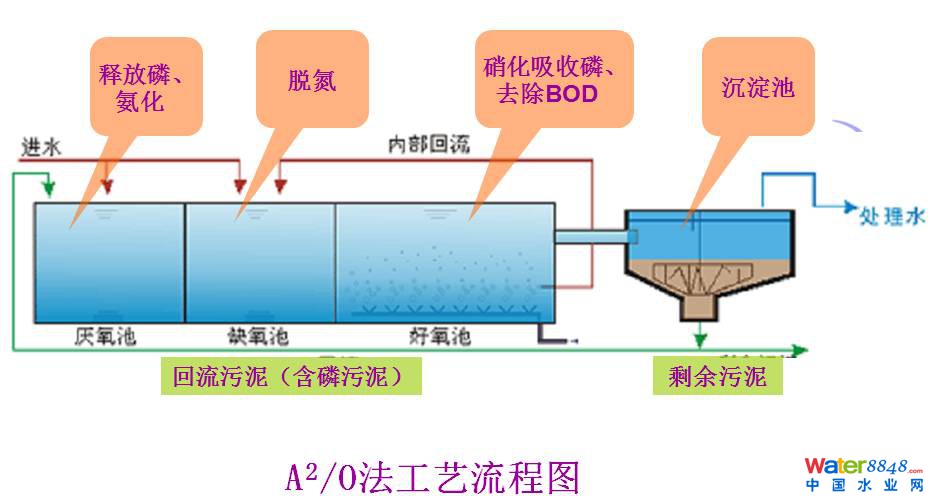 A2/O工藝是Anaerobic-Anoxic-Oxic的英文縮寫,它是厭氧-缺氧-好氧生物脫氮除磷工藝的簡稱。在該工藝流程內(nèi),BOD5、SS和以各種形式存在的氮和磷將一一被去除。A2O生物脫氮除磷系統(tǒng)的活性污泥中,菌群主要由硝化菌和反硝化菌、聚磷菌組成。在好氧段,硝化細(xì)菌將入流中的氨氮及有機(jī)氮氨化成的氨氮,通過生物硝化作用,轉(zhuǎn)化成硝酸鹽;在缺氧段,反硝化細(xì)菌將內(nèi)回流帶入的硝酸鹽通過生物反硝化作用,轉(zhuǎn)化成氮?dú)庖萑氲酱髿庵,從而達(dá)到脫氮的目的;在厭氧段,聚磷菌釋放磷,并吸收低級脂肪酸等易降解的有機(jī)物;而在好氧段,聚磷菌超量吸收磷,并通過剩余污泥的排放,將磷除去。 該工藝處理效率一般能達(dá)到:BOD5和SS為90%~95%,總氮為70%以上,磷為90%左右