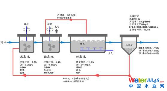 •在同時(shí)脫氧除磷去除有機(jī)物的工藝中,該工藝流程最為簡單,總的水力停留時(shí)間也少于同類其他工藝