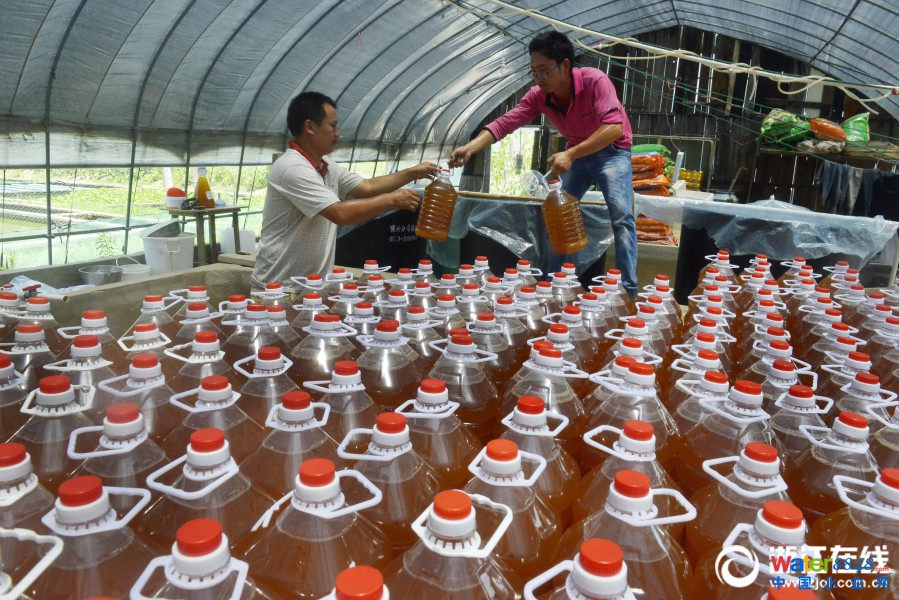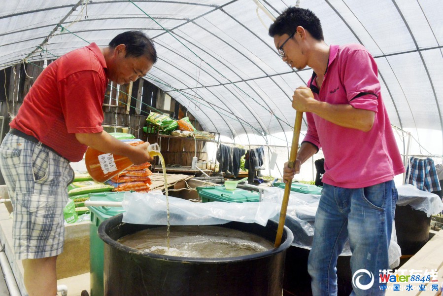 7月27日,浙江海洋大學(xué)工作人員正在舟山市定海區(qū)小展生產(chǎn)基地,用池塘底層污泥制作凈水劑。近年來,該大學(xué)水產(chǎn)學(xué)院儲張杰教授研究團(tuán)隊在池塘污泥中分離出185種菌株,通過上千次試驗,篩選出高效降解污水中氮磷的芽孢桿菌菌種,通過擴(kuò)大培養(yǎng),目前已制作微生物菌劑5000多公斤,該菌劑來源于池塘底泥,具有凈水效果好、凈水速度快,不產(chǎn)生二次污染等特點,為水產(chǎn)養(yǎng)殖污水處理與河道污水處理提供了新的途徑。(浙江在線拍友 胡社友 攝)