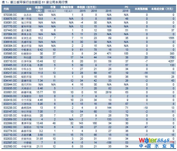 企業(yè)業(yè)績(jī)分化明顯,關(guān)注滿足創(chuàng)新層指標(biāo)的新增公司。根據(jù)Choice和Wind相關(guān)數(shù)據(jù),2017年479家新三板環(huán)保公司中61家進(jìn)入創(chuàng)新層。在2016年已進(jìn)入創(chuàng)新層的48家環(huán)保公司中,32家繼續(xù)滿足創(chuàng)新層標(biāo)準(zhǔn)。此外,根據(jù)全國(guó)股轉(zhuǎn)系統(tǒng)2017年5月30日發(fā)布的《2017年掛牌公司創(chuàng)新層篩選名單》,新增29家環(huán)保公司滿足創(chuàng)新層的篩選標(biāo)準(zhǔn),其中水處理14家,固廢處理7家,大氣治理2家,節(jié)能管理3家,環(huán)保監(jiān)測(cè)咨詢及信息化3家。