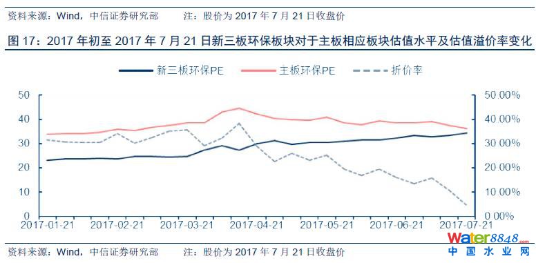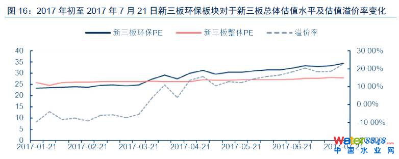 估值分析:新三板環(huán)保板塊較A股環(huán)保板塊折價(jià)33.33%,較新三板整體折價(jià)14.46%。截止2017年7月21日,A股環(huán)保板塊估值為36X,新三板環(huán)保板塊整體估值為28X。2016年新三板環(huán)保板塊平均估值為24X。溢價(jià)率方面,新三板環(huán)保板塊估值水平較新三板整體折價(jià)14.46%,較A股環(huán)保板塊折價(jià)33.33%。