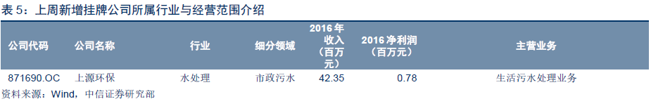 上周新增掛牌環(huán)保公司總結(jié)。2017年7月17日至7月21日,全國(guó)中小企業(yè)股份轉(zhuǎn)讓系統(tǒng)新增1家掛牌環(huán)保公司上源環(huán)保(871690.OC)。上源環(huán)保主要從事生活污水處理業(yè)務(wù)。