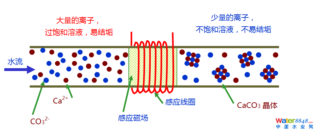 在調(diào)頻磁場的影響下,離子頻繁碰撞結(jié)晶,碳酸鈣晶體長大,這種晶體表面不帶電荷,性質(zhì)穩(wěn)定,不會粘附在管壁上;