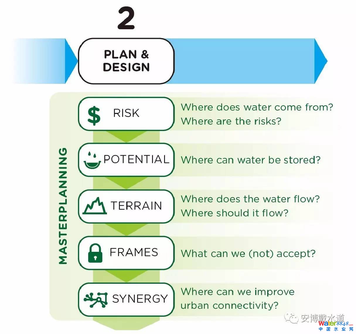 上圖總結(jié)了對(duì)形成總體規(guī)劃實(shí)際設(shè)計(jì)的綜合考慮。相關(guān)利益部門將仔細(xì)審查設(shè)計(jì)師和工程師調(diào)研和設(shè)計(jì)洪水流向、洪水存儲(chǔ)及輸送地帶的過(guò)程,從而對(duì)決策框架的制定或決策應(yīng)用給出限制或支持意見(jiàn),并最終確定該規(guī)劃與其它城市環(huán)境規(guī)劃的結(jié)合點(diǎn),如公園或自行車車道。相關(guān)利益部門可多次審查規(guī)劃設(shè)計(jì),每當(dāng)有新的發(fā)現(xiàn)時(shí)須隨時(shí)更新并改善設(shè)計(jì)。