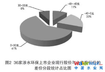 上市公司在經(jīng)營(yíng)過(guò)程中,上市發(fā)行價(jià)有升有降,本次統(tǒng)計(jì)以36家涉水環(huán)保上市企業(yè)2017年4月28日的收盤(pán)價(jià)作為現(xiàn)行股價(jià),并與上市發(fā)行價(jià)作比較。這個(gè)比較可以說(shuō)明股市投資的效果和投資者的決策能力,也間接表明了上市公司經(jīng)營(yíng)業(yè)績(jī)的好壞,F(xiàn)行股價(jià)與上市發(fā)行價(jià)的差價(jià)分段統(tǒng)計(jì)見(jiàn)圖2。