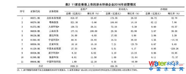 11家在香港上市的涉水環(huán)保企業(yè)2016年總資產(chǎn)額達(dá)1826.22億港元,同比增長(zhǎng)18.66%;營(yíng)業(yè)收入總額達(dá)426.54億港元,同比增長(zhǎng)16.76%;凈利潤(rùn)總額達(dá)101.62億港元,同比增長(zhǎng)20.10%。