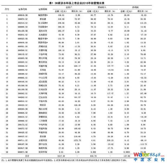 36家涉水環(huán)保上市企業(yè)2016年總資產(chǎn)總額達(dá)3317.30億元,同比增長(zhǎng)20.73%;營(yíng)業(yè)收入總額達(dá)842.70億元,同比增長(zhǎng)22.34%;歸屬于上市公司股東的凈利潤(rùn)總額達(dá)137.89億元,同比增長(zhǎng)-0.21%。