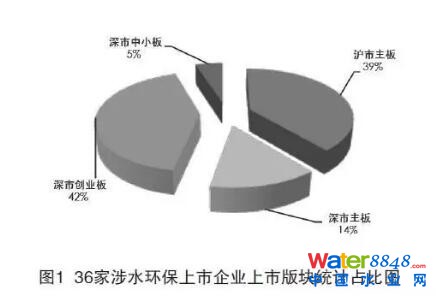上市企業(yè)可以根據(jù)企業(yè)自身的情況和特點(diǎn)選擇上市的交易所和版塊。深市分主板、創(chuàng)業(yè)板和中小板,滬市只有主板。36家涉水環(huán)保上市企業(yè)中滬市主板有14家,深市主板有5家,深市創(chuàng)業(yè)板有15家,深市中小板有2家,見(jiàn)圖1?梢钥闯,36家涉水環(huán)保上市企業(yè),主板上市占據(jù)主體,占總數(shù)的53%,創(chuàng)業(yè)板占42%,中小板占5%。