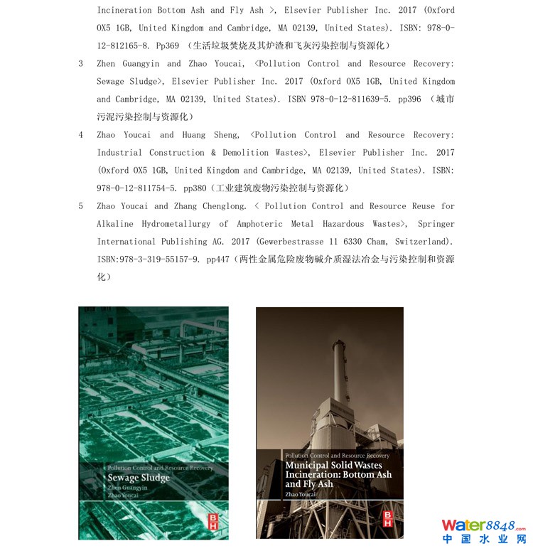 5 Zhao Youcai and Zhang Chenglong. < Pollution Control and Resource Reuse for Alkaline Hydrometallurgy of Amphoteric Metal Hazardous Wastes>, Springer International Publishing AG. 2017 (Gewerbestrasse 11 6330 Cham, Switzerland). ISBN:978-3-319-55157-9. pp447(兩性金屬危險廢物堿介質(zhì)濕法冶金與污染控制和資源化)