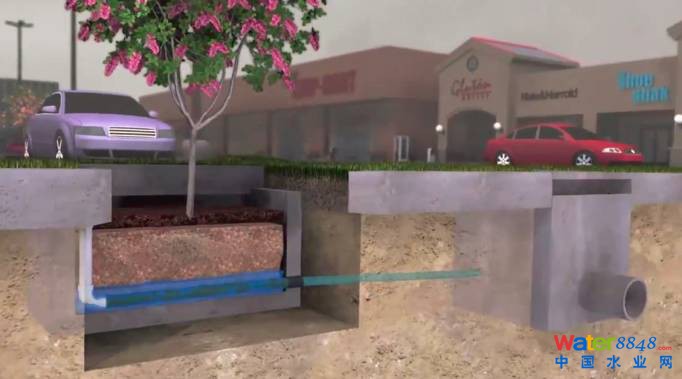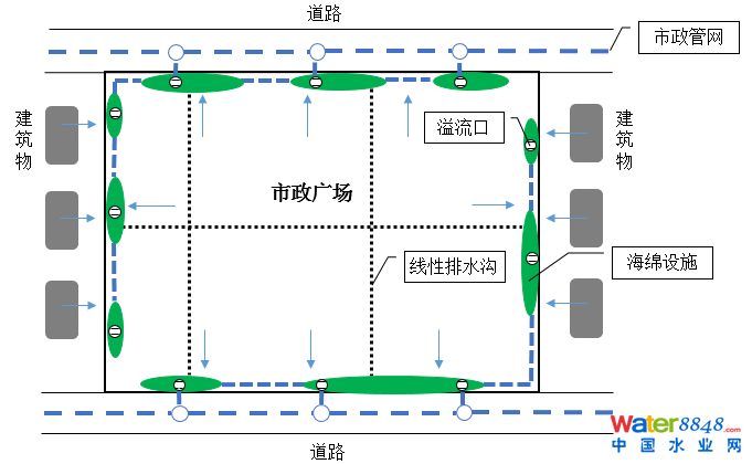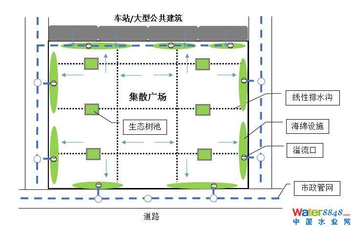 ④市政廣場的海綿設(shè)施均設(shè)置溢流管,超過設(shè)計標準的雨水溢流入市政管網(wǎng)。
