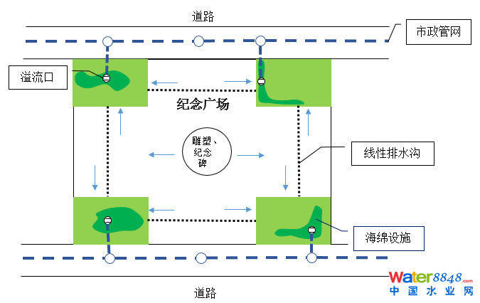 ④紀念廣場的海綿設(shè)施均設(shè)置溢流管,超過設(shè)計標準的雨水溢流入市政管網(wǎng)。