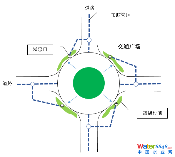 ②交通廣場一般不涉及人的公共活動,宜設(shè)計為下沉式,采用小型濕地、濕塘等具有調(diào)蓄功能的海綿設(shè)施,收集與凈化路面雨水徑流。