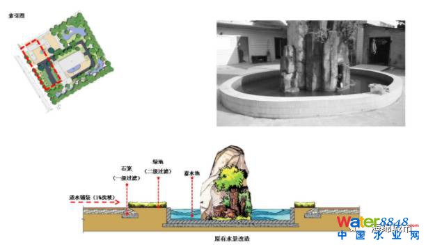改造后成為雨水花園教育和宣傳的基地。水景設計尺度適宜,對凈化后雨水的利用成為其亮點,潺潺的水聲讓人感覺放松和寧靜,午后這里成為員工休閑交流的重要場所,同時也吸引兒童樂此不疲的戲水玩而耍。