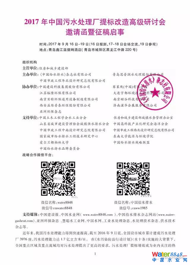 2017年中國污水處理廠提標(biāo)改造高級研討會邀請函暨征稿啟事