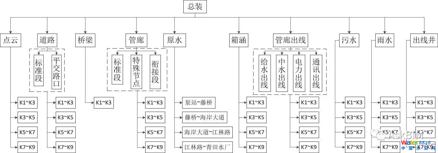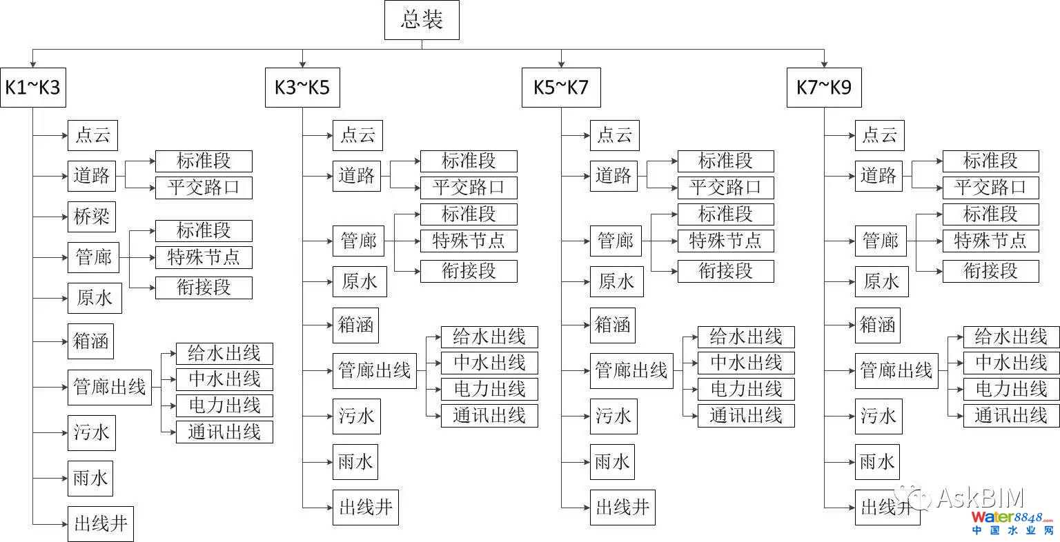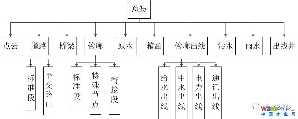 本次建模針對(duì)道路工程、原水工程、綜合管廊工程、廊內(nèi)管線出線(電力、通訊、中水、給水、廊內(nèi)集水池)、橋涵工程、雨水工程、污水工程。針對(duì)綜合管廊的節(jié)點(diǎn)進(jìn)行建模(廊內(nèi)管線、預(yù)留預(yù)埋、消防、支吊架、支墩、廊內(nèi)排水),建模范圍K1+774~K9+424.4。