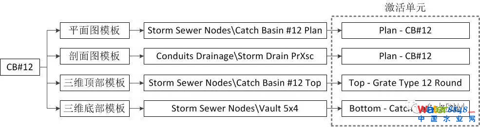 打開前述cell,較為快捷的修改方式如下:制作上述三個(gè)激活單元以及CB#12文件副本,并進(jìn)行相應(yīng)的重命名,參照?qǐng)D集或者CAD圖紙繪制井類,重新建立圖7.1中的鏈接,完成雨水口的自定義。
