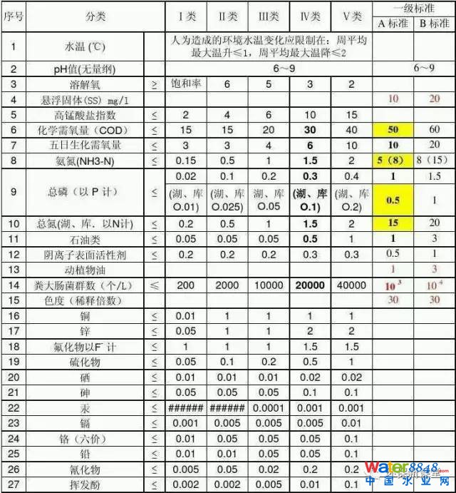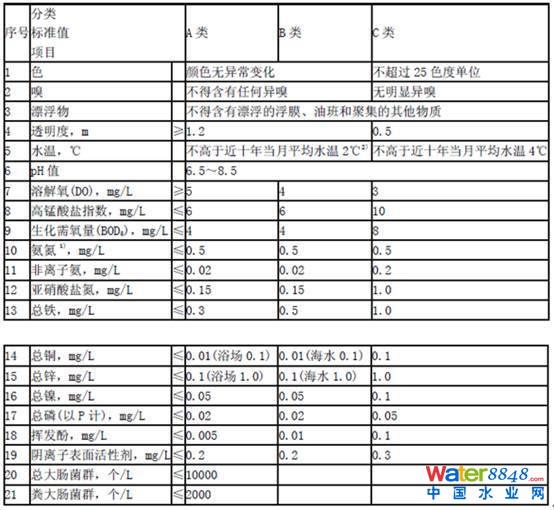 兩者共同的指標有:水溫、pH值、溶解氧、高錳酸鹽指數(shù)、BOD5、氨氮、總磷、銅、鋅、揮發(fā)酚、陰離子表面活性劑和糞大腸菌群。
