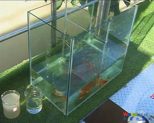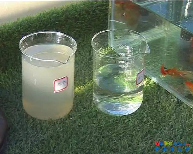 經(jīng)處理過的準四類水質,與進水水質相比,水體變得清澈透明,將其放入一旁的魚缸上,幾條紅色的金魚在水中快樂地游著。