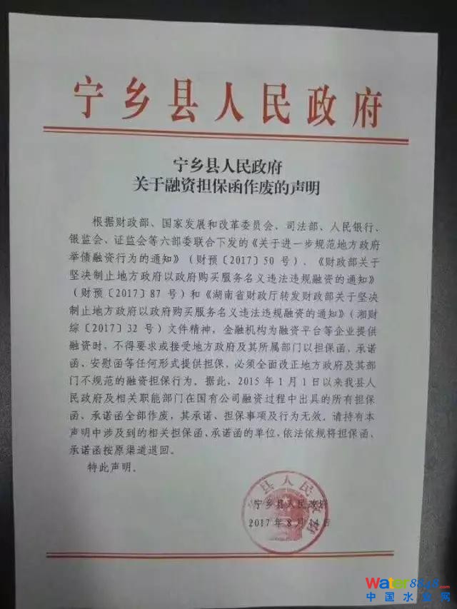 今天(8月23日),網(wǎng)上流傳一份寧鄉(xiāng)縣人民政府關(guān)于融資擔(dān)保函作廢的聲明刷屏朋友圈,與以往撤函不同的是,這次地方政府撤函顯得簡單粗暴,直接宣布所有擔(dān)保函、承諾函全部作廢。《華夏時(shí)報(bào)》記者從與相關(guān)機(jī)構(gòu)處證實(shí)了此函的真實(shí)性。