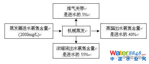 進(jìn)入蒸發(fā)器后的氨氮通過三個(gè)途徑排出蒸發(fā)器:蒸餾出水、濃縮液出水、排氣夾帶。由于氨在水中的溶解度極大,所以排氣中夾帶氨量很少,蒸發(fā)之后的氨氮主要存在于濃縮液和蒸發(fā)出水中。因此蒸發(fā)工藝出水氨氮含量高,一般不能達(dá)到排放標(biāo)準(zhǔn)的要求,需增加后續(xù)去除氨氮的設(shè)施。以進(jìn)水氨氮2000mg/L計(jì)算為例,其平衡圖見圖1。由于蒸發(fā)之后的氨氮含量仍遠(yuǎn)遠(yuǎn)高于排放標(biāo)準(zhǔn)的要求,因此蒸發(fā)后必須進(jìn)行脫氮處理。目前國(guó)內(nèi)常用的方法是采用離子交換法去除氨氮。