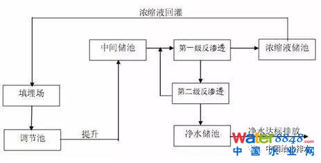 滲濾液直接進(jìn)行膜分離技術(shù)是指滲濾液不進(jìn)行生化處理,經(jīng)過簡(jiǎn)單的預(yù)處理后直接進(jìn)入反滲透處理系統(tǒng),反滲透清液出水達(dá)標(biāo)排放,產(chǎn)生的濃縮液回灌填埋場(chǎng)或送城市污水處理廠,其工藝流程見圖2。