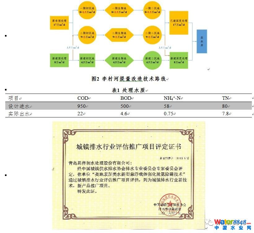 同時對改造和新建工程進行了能耗追蹤,一期和二期噸水電耗從改造前的;降至;三期新建工程噸水電耗為,出水標準提高而能耗降低,主要源于采用微動力混合池型,取消推流器,降低推流器電耗;同時,懸浮填料填充率增加,大幅提高氧利用率,降低曝氣能耗。