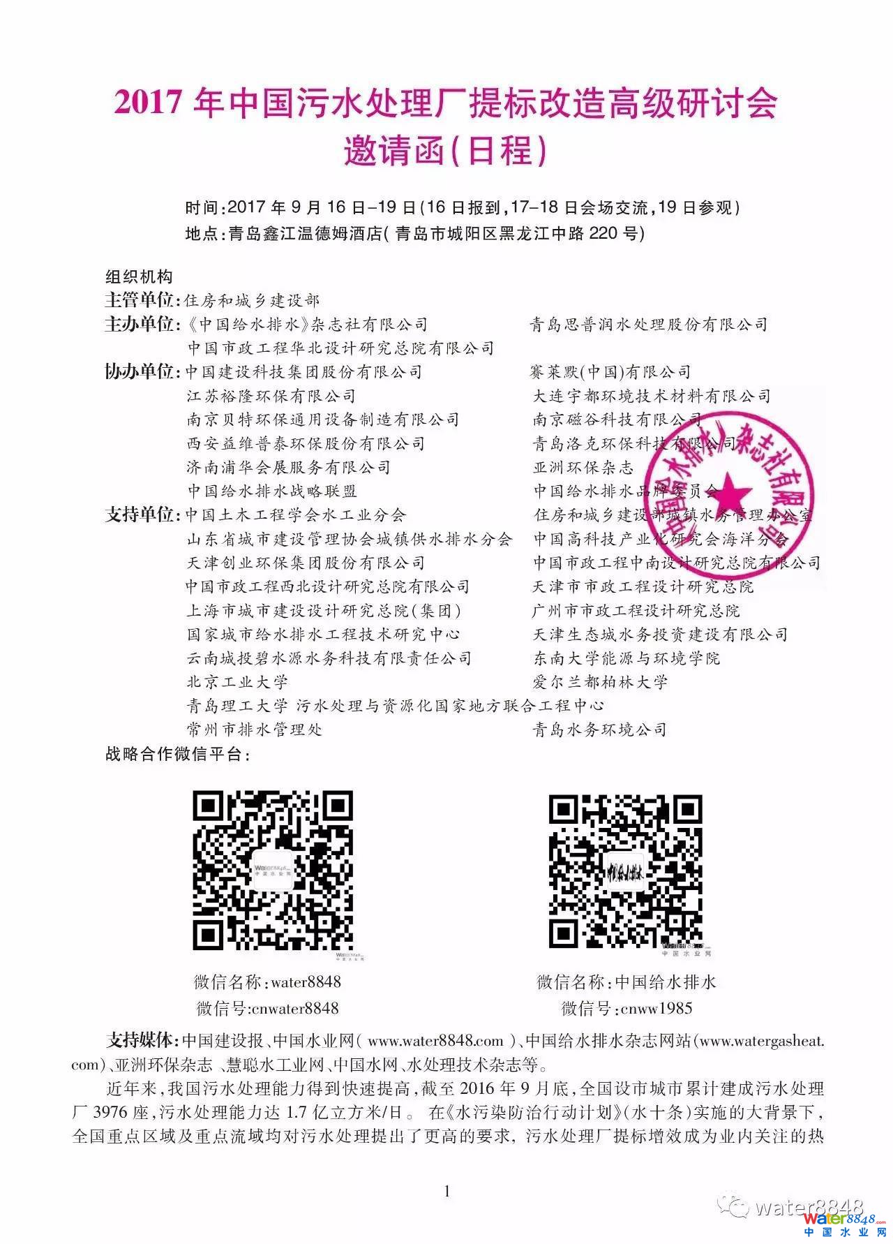 2017年中國污水處理廠提標(biāo)改造高級研討會邀請函暨日程
