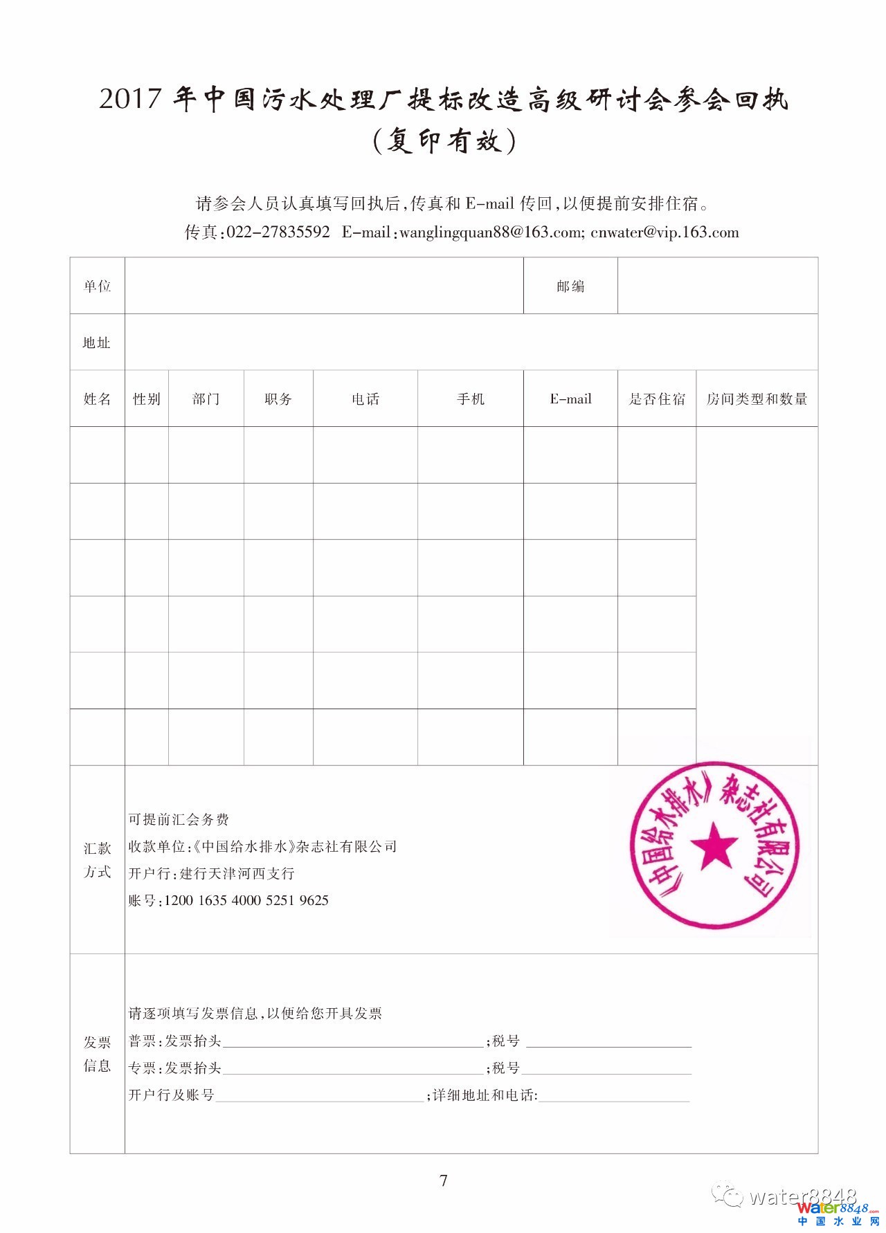 2017年中國污水處理廠提標(biāo)改造高級研討會參會回執(zhí)(復(fù)印有效)