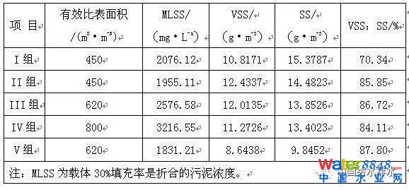 懸浮載體投加量以表面負荷作為設(shè)計參數(shù),由其計算出的結(jié)果為表面積,選擇不同類型的懸浮載體,因有效比表面積不同,必然會有不同的載體量。可見,有效比表面積的準(zhǔn)確確定具有重要意義。