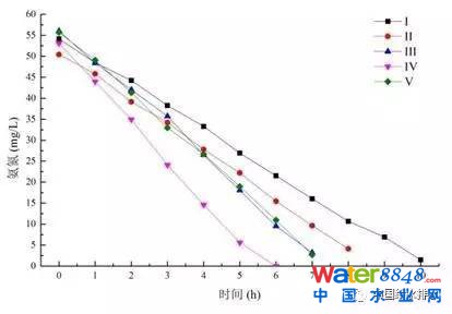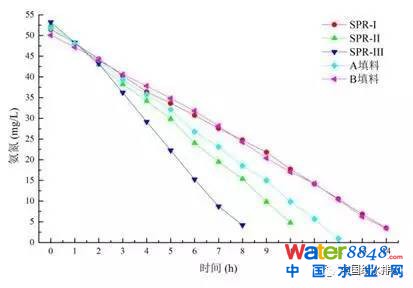 為進一步驗證,參照《行業(yè)標(biāo)準(zhǔn)》進行了載體硝化負荷的測定,結(jié)果如圖1及表4所示。測定條件:溫度為20 ℃,進水氨氮為(55±5) mg/L,在20 L反應(yīng)器、載體填充率為30%時按SBR運行,控制DO為4~6 mg/L,每隔1 h取樣測定,直至反應(yīng)器內(nèi)氨氮<5 mg/L。
