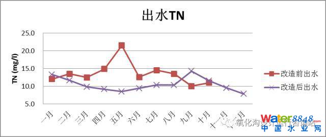 沒有投加碳源而實現(xiàn)了出水總氮達標,總氮出水指標為10.4mg/l,低于15mg/l要求。
