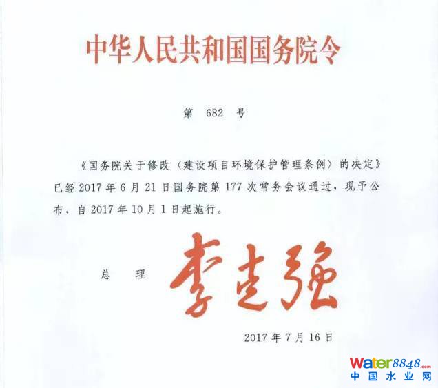 《國(guó)務(wù)院關(guān)于修改〈建設(shè)項(xiàng)目環(huán)境保護(hù)管理?xiàng)l例〉的決定》已經(jīng)2017年6月21日國(guó)務(wù)院第177次常務(wù)會(huì)議通過(guò),現(xiàn)予公布,自2017年10月1日起施行。