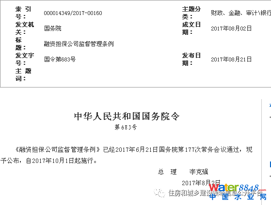 為了規(guī)范融資擔(dān)保公司的行為,防范風(fēng)險(xiǎn),2017年8月2日,國(guó)務(wù)院總理李克強(qiáng)簽署國(guó)務(wù)院令683號(hào),公布《融資擔(dān)保公司監(jiān)督管理?xiàng)l例》(以下簡(jiǎn)稱條例),自2017年10月1日起施行。