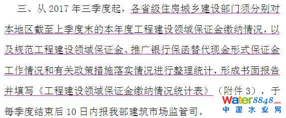 日前住建部發(fā)布建辦市函[2017]460號(hào)文,明確要求各省級(jí)住房城鄉(xiāng)建設(shè)部門(mén)須每季度要把推廣銀行保函替代現(xiàn)金形式保證金工作情況和有關(guān)政策措施落實(shí)情況進(jìn)行整理統(tǒng)計(jì),形成書(shū)面報(bào)告,進(jìn)行上報(bào),意思也很明確:各省要加快推廣銀行保函替代現(xiàn)金形式保證金