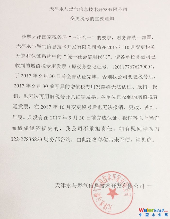 按照天津國家稅務(wù)局“三證合一”的要求,財(cái)務(wù)部統(tǒng)一部署,天津水與燃?xì)庑畔⒓夹g(shù)開發(fā)有限公司將在2017年10月變更稅務(wù)開票和認(rèn)證系統(tǒng)中的“統(tǒng)一社會(huì)信用代碼”。請(qǐng)各單位務(wù)必將已收到的增值稅專用發(fā)票(原稅務(wù)登記證號(hào):120117767627909),于2017年9月30日前全部認(rèn)證完畢。否則我公司變更稅號(hào)后,2017年9月30前開具的增值稅專用發(fā)票將無法認(rèn)證、抵扣、報(bào)銷,也無法再用舊稅號(hào)開具紅字發(fā)票。各單位已收到的增值稅普通發(fā)票,在2017年10月變更稅號(hào)后也無法報(bào)銷、更改、沖紅、作廢。凡沒有在2017年9月30日前完成認(rèn)證、報(bào)銷等以上操作而造成經(jīng)濟(jì)損失的,我公司不承擔(dān)責(zé)任。如有疑問請(qǐng)撥打022-27836823財(cái)務(wù)部咨詢,由此給各單位帶來不便,請(qǐng)見諒。