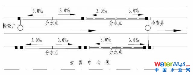 《城市道路設(shè)計(jì)規(guī)范》中規(guī)定,當(dāng)?shù)缆分行木縱坡度小于0.3%時(shí),為保證路面排水,宜在道路兩側(cè)車行道邊緣1~3m寬度范圍內(nèi)設(shè)鋸齒形偏溝,或采用加密雨水口設(shè)置方式;在平坡路段全程設(shè)置(。┯晁。此時(shí)雨水口數(shù)量一般均能滿足雨水徑流量要求,采用何種雨水口的布置形式,適合工程具體情況顯得尤為重要。